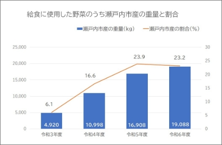 こどもたちの給食に使用される野菜のうち、年間の取扱数量(重量ベース)に占める瀬戸内市産の割合は、令和3年度の6.1%から令和7年3月末現在では23.2%まで増加しましたが、地場産物の利用量及び利用率は依然として低い状況です。