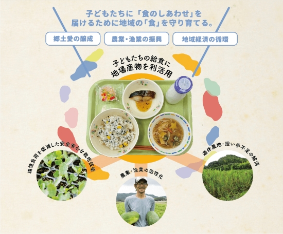 地域の生産者が生産した地場産物を学校や園の給食に積極的に活用することで、地域の「食」をこどもたちへつなぎ、豊かな食の経験を提供し、健やかな成長を支援します。また、農業や漁業の活性化、地域経済の循環を目指します。