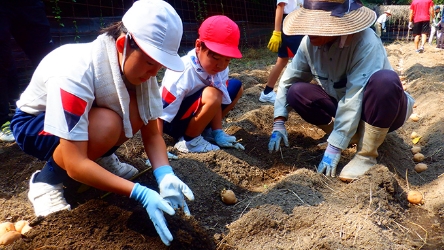 - こどもたちが生産者や地域の方とともに農業体験を行ったり、生産者が学校や園を訪問し、出前授業を通じて交流したりすることで、生産者の思いや地元の農業、食への関心を高めています。また、こどもたちや保護者に地産地消の良さを伝えるとともに、給食には生産・運搬・調理などさまざまな人々が関わっていること等を伝えることで、食に関する視野を広げ、感謝の気持ちを育んでいます。